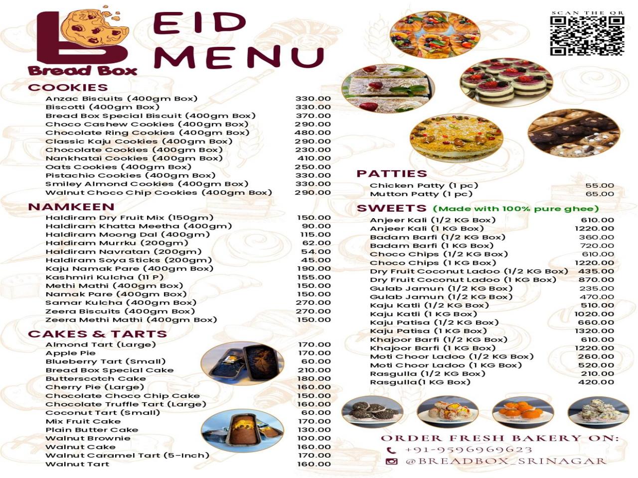 Cakes, Tarts, Cookies, Patties, Namkeen and Sweets.